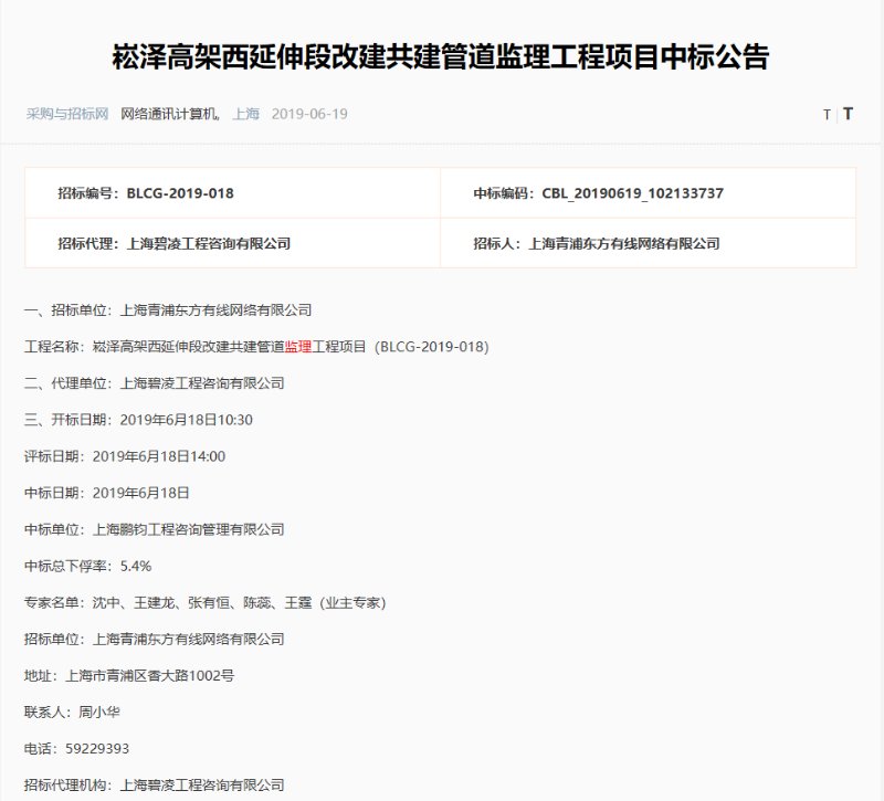 6月18日,招标人上海青浦东方有线网络有线公司的崧泽高架西延伸段改建共建管道